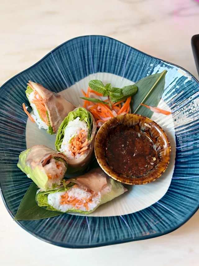 - Rolinhos frescos de papel de arroz com porco char siu, ervas aromáticas, vermicelli de arroz e salada, nuoc mam