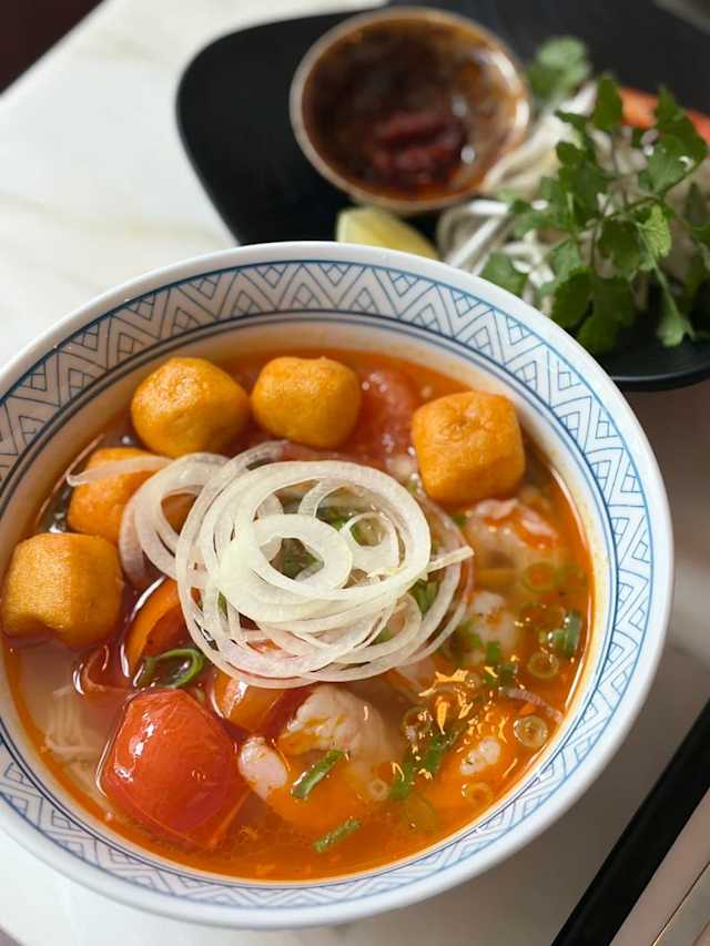 - Caldo de tamarindo com cogumelos, tofu frito, tomate, pasta de soja, cebola, coentros, vermicelli de arroz, lima