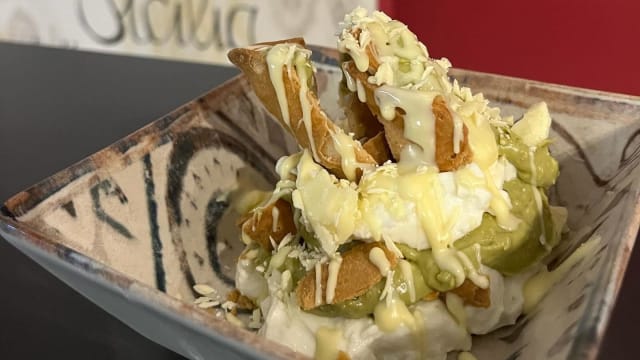 Patatine con stracciatella e pistacchio