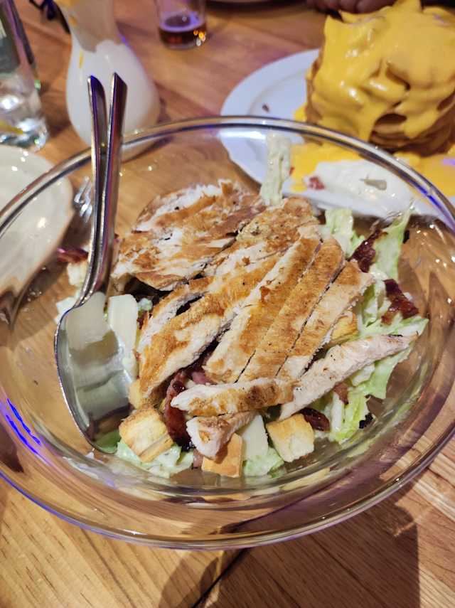 - La mítica ensalada Cesar, lechuga romana, bacon crujiente, picatostes, queso parmesano y salsa césar, con una pechuga de pollo a la plancha elaborada al momento