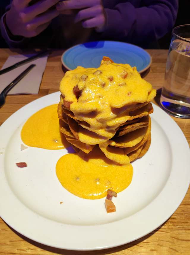 - La versión australiana del clásico chicken&wafles, gofres, rúcula, solomillos de pollo empanado, bacon crujiente y un huevo frito, aderezado con sirope de arce