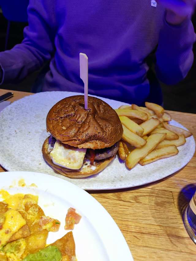 - Pan brioche potato, hamburguesa poco hecha de vaca madurada, queso edam, cebolla crispy, costillas de cerdo deshuesada y salsa BBQ, acompañada de patatas fritas