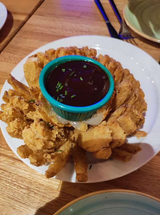 - Seleccionando los mejores productos, presentamos nuestra flor de cebolla crujiente acompañada de miel y mostaza o barbacoa