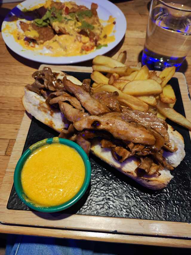 - Montañas de carne braseada con salsa agridulce, crema de queso, en pan bombón, acompañado de patatas fritas caseras