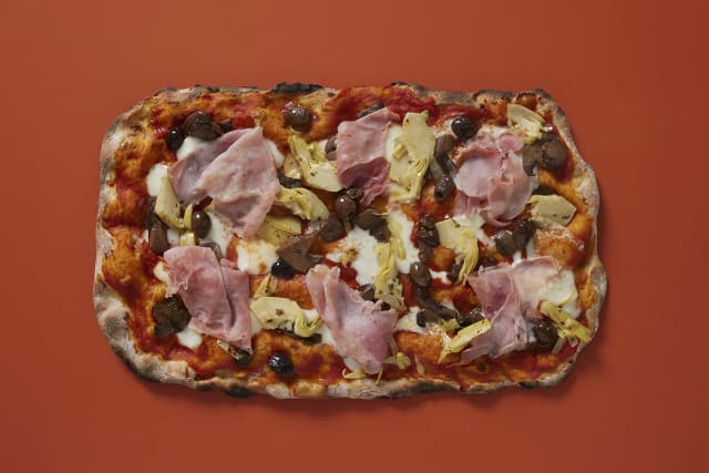 - Salsa di pomodoro, mozzarella fiordilatte di colfiorito, prosciutto cotto, carciofi, funghi freschi, olive nere