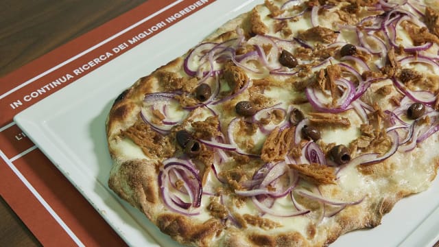 - Salsa di pomodoro, feta, cipolla rossa, olive taggiasche, origano, pomodorini confit