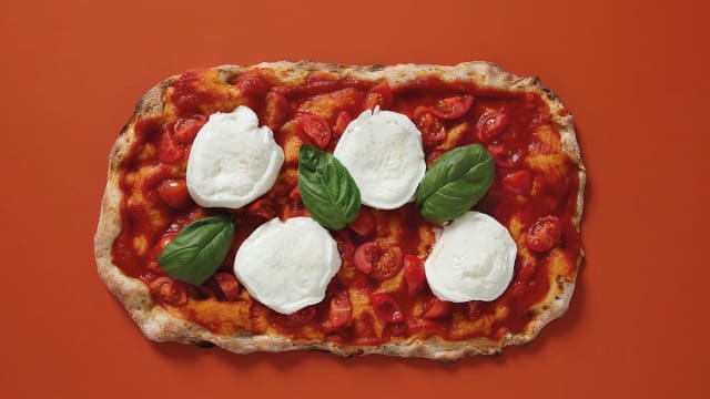 - Salsa di pomodoro, mozzarella fiordilatte di colfiorito, basilico