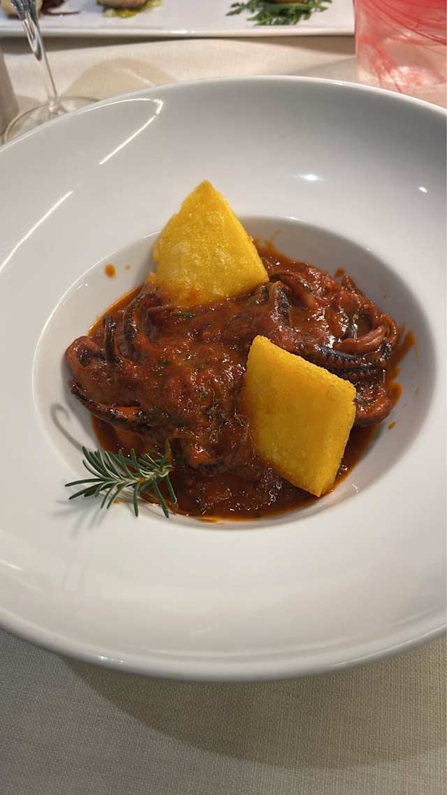 - Polpo scottato su crema di patate allo zafferano pomodorini confit e chips di pane
