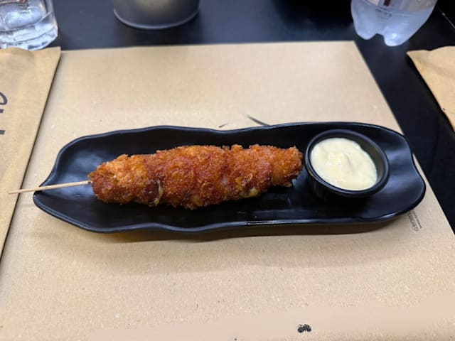 Ripieno di cheddar e maionese dolce piccante, avvolto nel bacon, con cheddar e panatura ai corn flakes o speziata