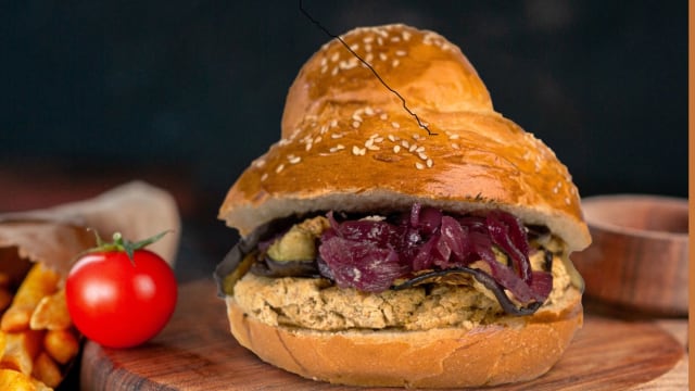 Hamburger di ceci, melanzane grigliate, cipolla marinata, salsa a piacere