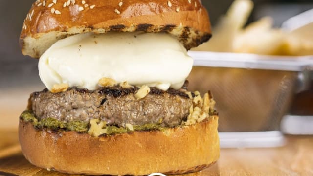 Hamburger di manzo 100% italiano da gr. 200, cacio piastrato, speck, carciofi, salsa tartara.