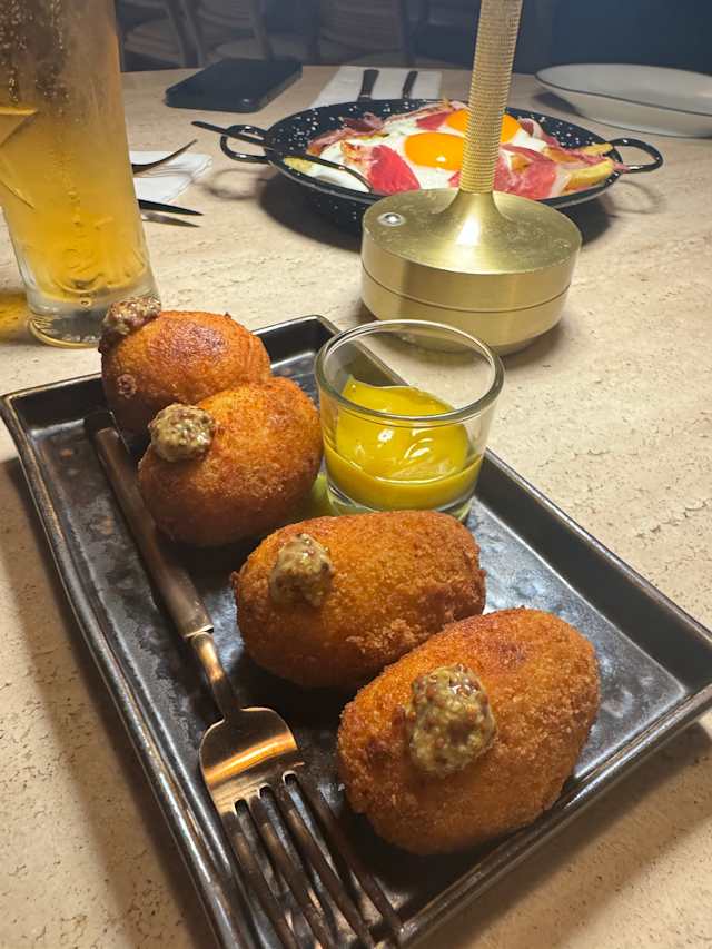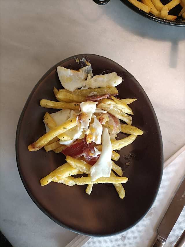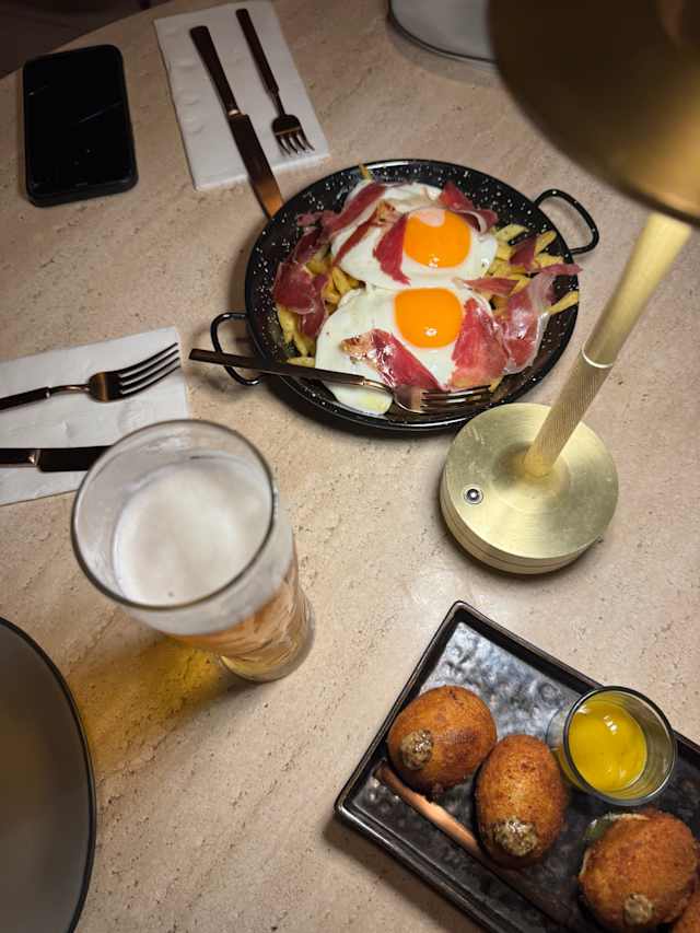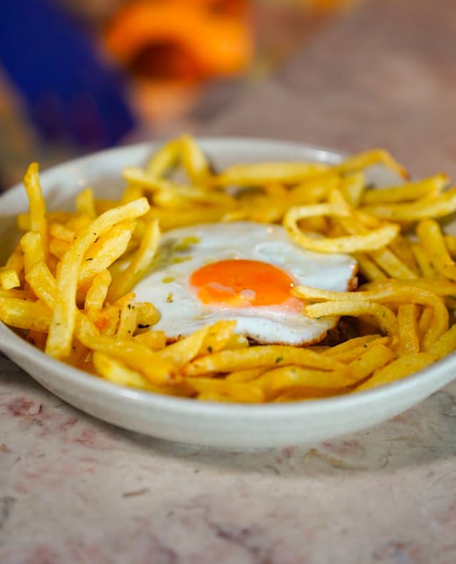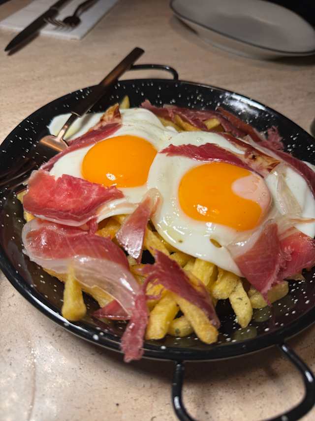 Carne 100% black angus na caçarola, presunto pata negra, ovo a cavalo, pickles e batatas fritas