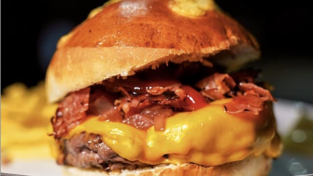 Carne 100% black angus (160g). queijo cheddar, crispy bacon, cebola roxa caramelizada e maionese de barbecue fumada