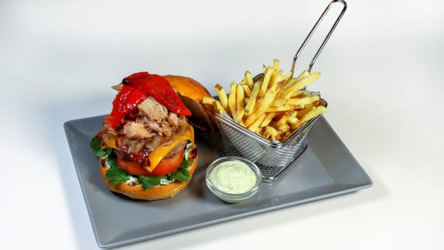 Hambúrguer novilho com molho barbecue, agrião, queijo, bacon, pimentos assados, chutney de cebola e pulled pork