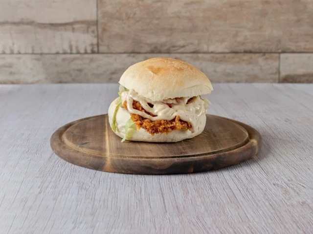 - Pane artigianale, manzo o pollo, cipolla caramellata, insalata, pomodoro, maionese