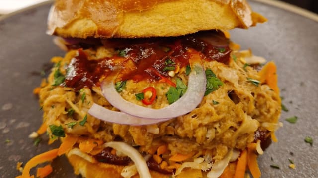 Buns délice de notre boulanger, jarret et épaule de porc suisse confits à la bière fumée du Jorat pendant 12h, oignons rouges, piments oiseau, carottes, céleris pomme, sauce barbecue du chef