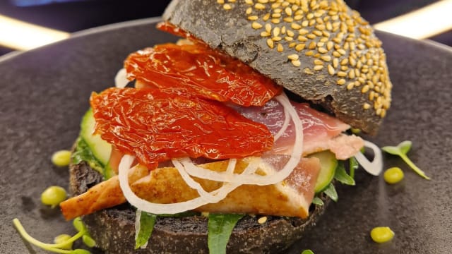 Buns traditionnels de notre boulanger, galette végé, cœur de laitue sucrine, tomate grillée, confit d’oignons rouge, caviar d’aubergines