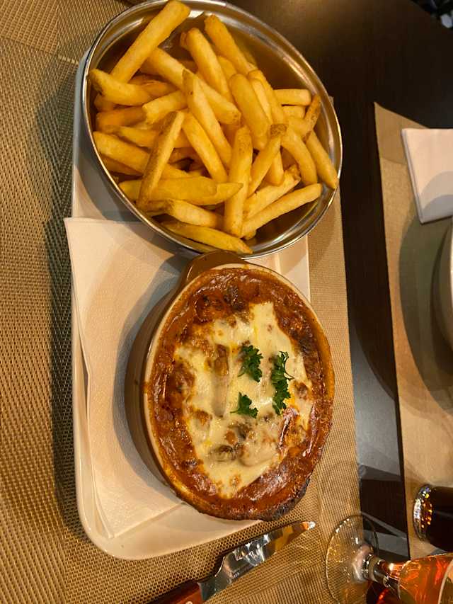 - Oxfilé, kycklingfilé, paprika, champinjoner, lök, husets kryddor och grädde. Serveras med pommes frites