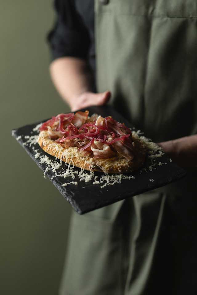 - 24 stunden gegärter sauerteig mit crème fraîche, zwiebeln, 2-jährigem greyerzer aus der käserei düdingen und rohessspeck