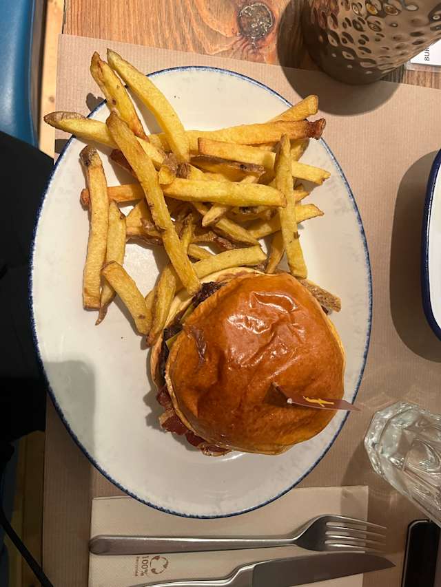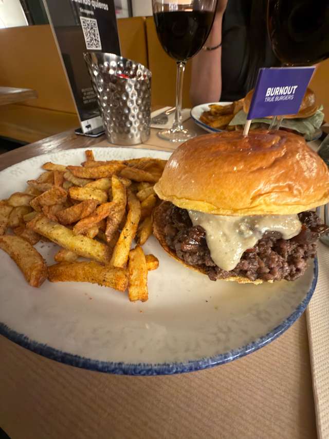 - 180grs de carne fresca de nuestro blend de vaca gallega, queso cheddar, bacon crujiente, lechuga, tomate, pepinillo, cebolla roja macerada, y salsa burnout mayo. Incluye patatas fritas o ensalada verde.