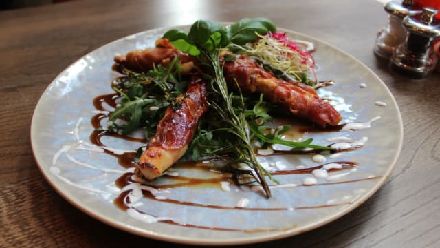 Gebakken rolletjes van kipfi let gemarineerd met verse kruiden gewikkeld in pancetta geserveerd met kaassaus