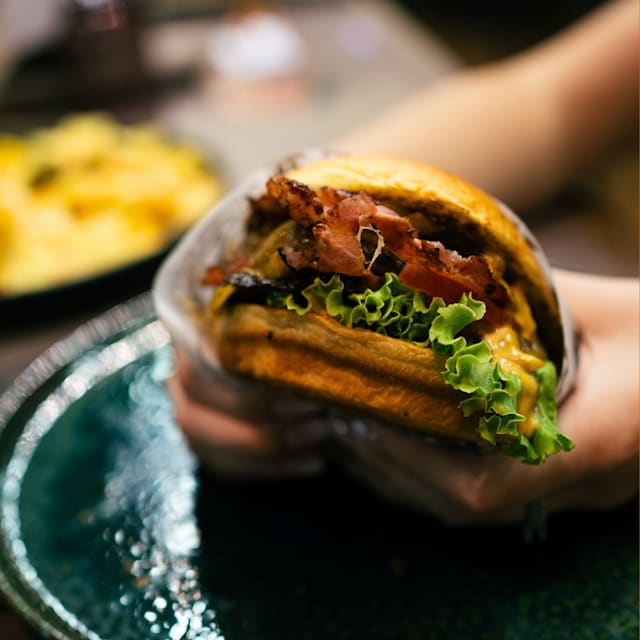 Soffice bun*, smash di carne di manzo o premium da 90gr.*, cheddar, bacon croccante, salsa american, servito con croccanti patatine*