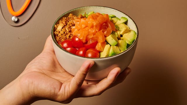 Base de arroz, salmón marinado en nuestra salsa ponzu, edamame, cebolla frita, aguacate, tomate cherry y sésamo.