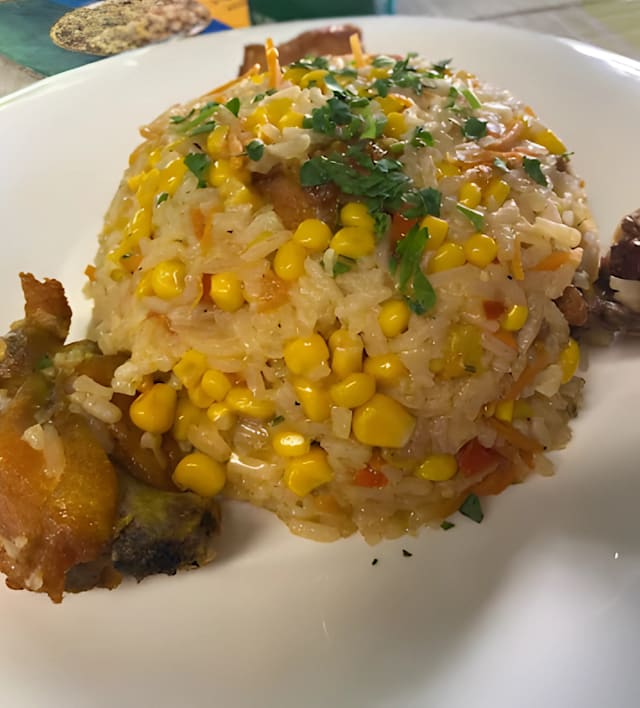 - Carne di manzo grigliata con riso, rucola, farina di mandiocа