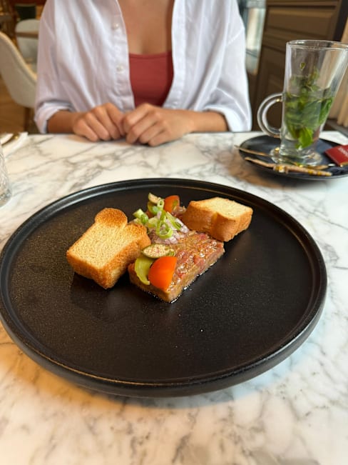 8/10I will return back for the fancy and cozy interior, quiet atmosphere, great champagne (for the great value!!!) and obviously good ice cream (Mövenpick ????). Bites were also good and in a generous amount. Food itself was simply not bad. But worth to keep in mind for bites-champagne-ice cream!!!