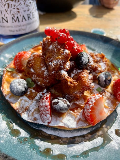 7.5/10The restaurant is on a nice corner. The server was friendly enough. The food was a joke. I ordered chicken and waffles and got maybe 5 tiny pieces of chicken and the absolute thinnest waffle I’ve ever seen in my life, and was charged around €15 for it. Won’t go back to this restaurant just based on how cheap they are to serve such a thin waffle to save money.