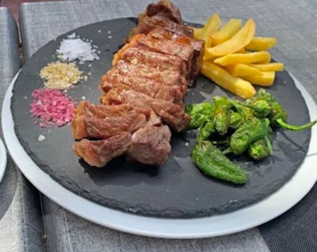 Entrecot de vaca madurada (500g), con pimientos de padrón y patatas fritas