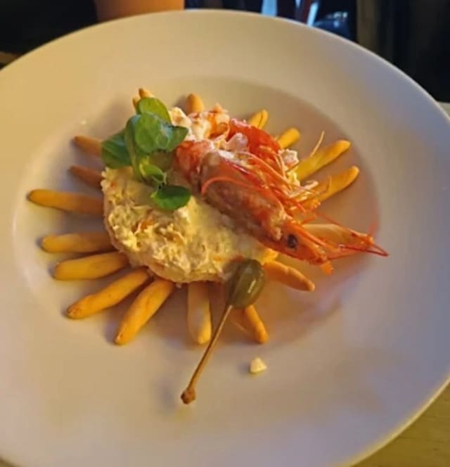Capelli de calabaza al azafrán con crema de carabineros, chipirones y langostinos