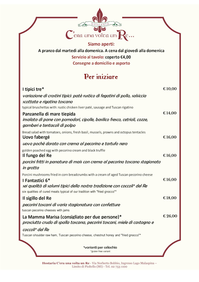 FUORI DAL TEMPO - Il ristorante Hostaria C'era una volta un Re... è un angolo al di fuori dal tempo. Vi propone un ambiente familiare e l'atmosfera delle salette riservate sono ideali per apprezzare la tradizione più genuina dei sapori classici Toscani, con grandi spunti di creatività. MENU VARIO...