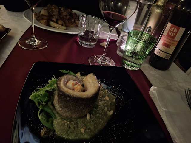 Turbante di branzino ripieno di gamberi su crema di piselli e crumble di pane