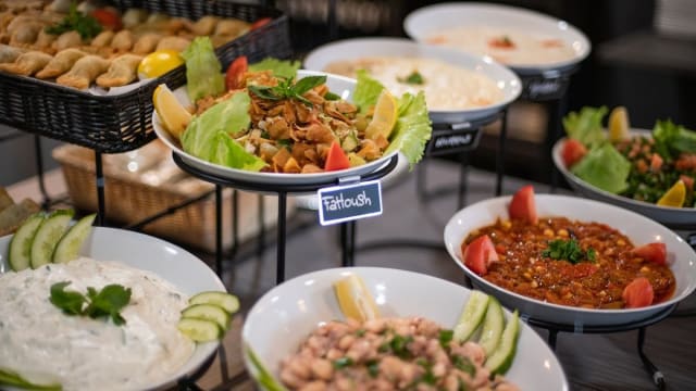 Chou-fleur et aubergine grillés, taboulé, fatayer aux épinards, beignet au fromage, falafel, houmous, fassolia