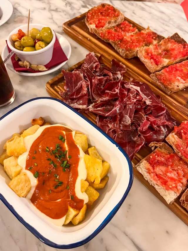 - Huevos, patatas, jamón ibérico, cebolla crujiente