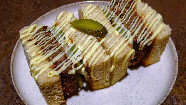 - Katsu sando de carrillera de cerdo (opción con Heura), encurtido de manzana, maionesa japonesa