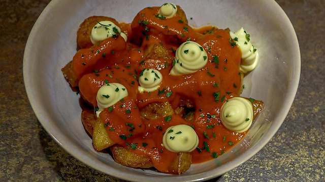 - Hotdog de pulpo, ketchup de pimiento rojo, allioli, cebolla crujiente