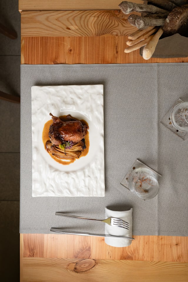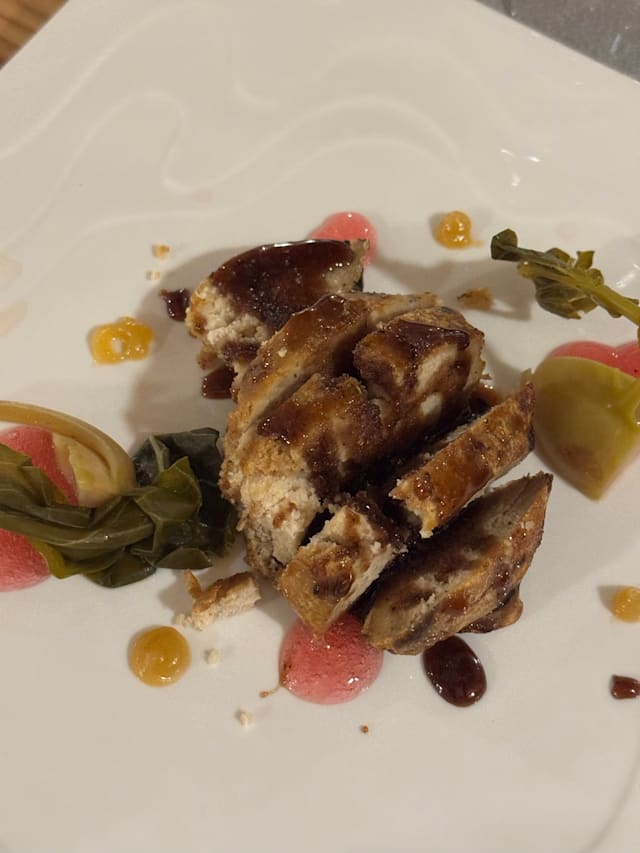 Galletto allevato al miele e latte, oca, anatra e il suo foie gras, chutney di pere all'artemisia