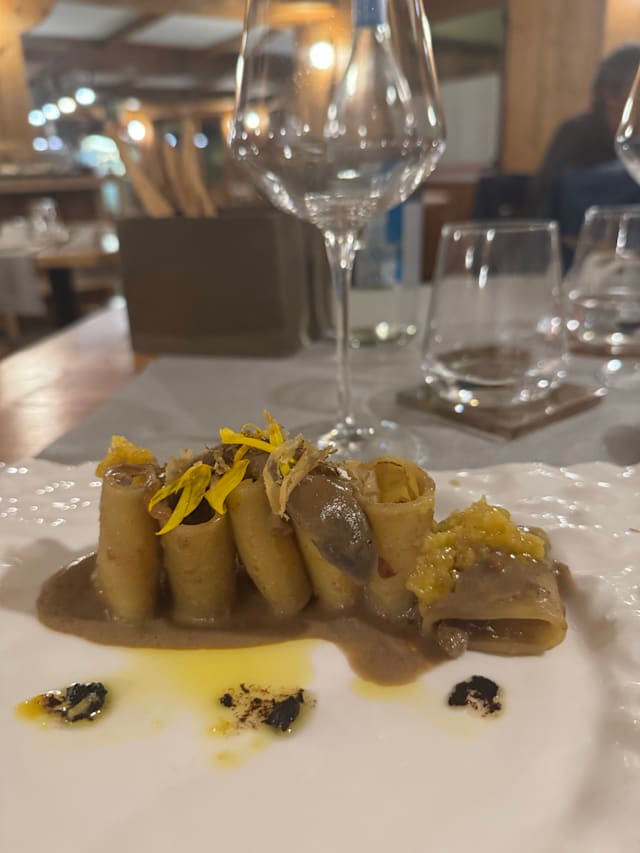 Cannellone di "pasta grezza" melanzana e nocciole gratinato alla toma con gocce di colori dell'orto