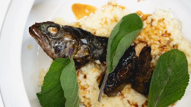 Spaccato di trota farcita al burro e saleggia, polenta morbida di miglio e latte