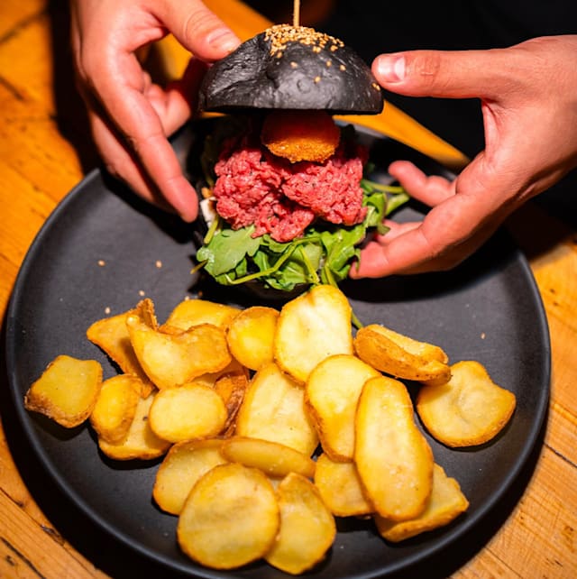 Tartare di scottona con tuolo fritto, burrata e cipolla caramellata