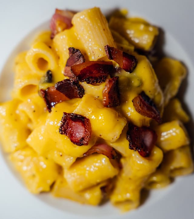 (Paccheri, guanciale, croccante, ragu e burrata)