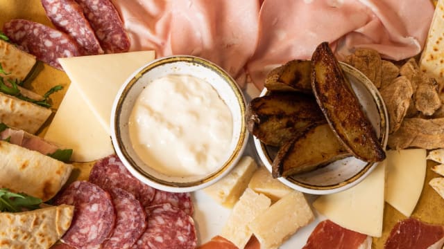 Prosciutto crudo di Parma DOP, Mortadella di Bologna IGP, salsiccia passita, Grana Padano DOP, Provolone dolce Valpadana DOP, pomodori secchi sott'olio e insalata, bartlaz