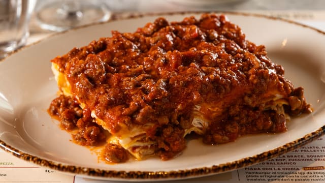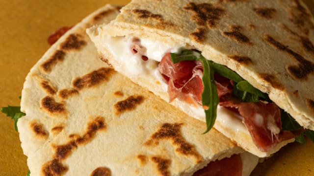 Hamburger di razza Chianina IGP servito nella piada artigianale, crema calda di pecorino Romano DOP, prosciutto di Parma DOP 24 mesi croccante, pomodoro e insalata mista
