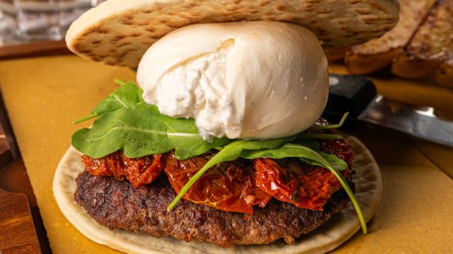 Hamburger di Scottona (200g) servito nella piada artigianale con burrata, pomodori secchi sott’olio, rucola fresca.