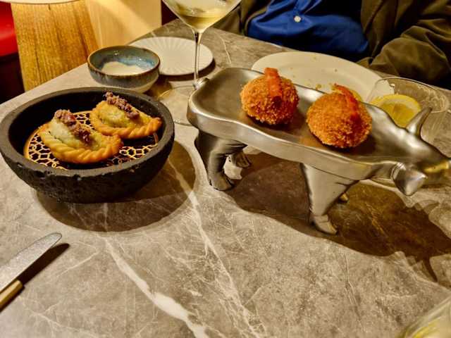 - Migas de cangrejo azul en revuelto de huevos camperos y calamarets crujientes.