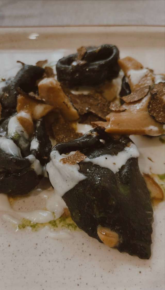 Tortelloni neri al carbone ripieni di ricotta del caseificio le 4 madonne e finferli serviti su crema di pecorino con finferli e salsa al prezzemolo