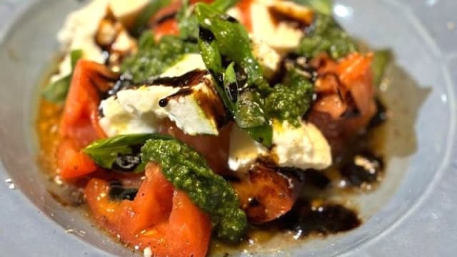 Pão de mistura, tomate pomodoro, balsâmico, salsa, vinagrete de limão, manjericão e mozzarella.