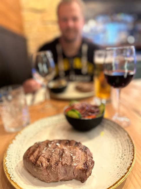 7/10To claim to be a meat expert we were a bit disappointed because our 4 steaks was not very tender. It tasted ok, but the lack of tenderness and not very sharp knives destroyed our experience. Staff was friendly but not very good in english.